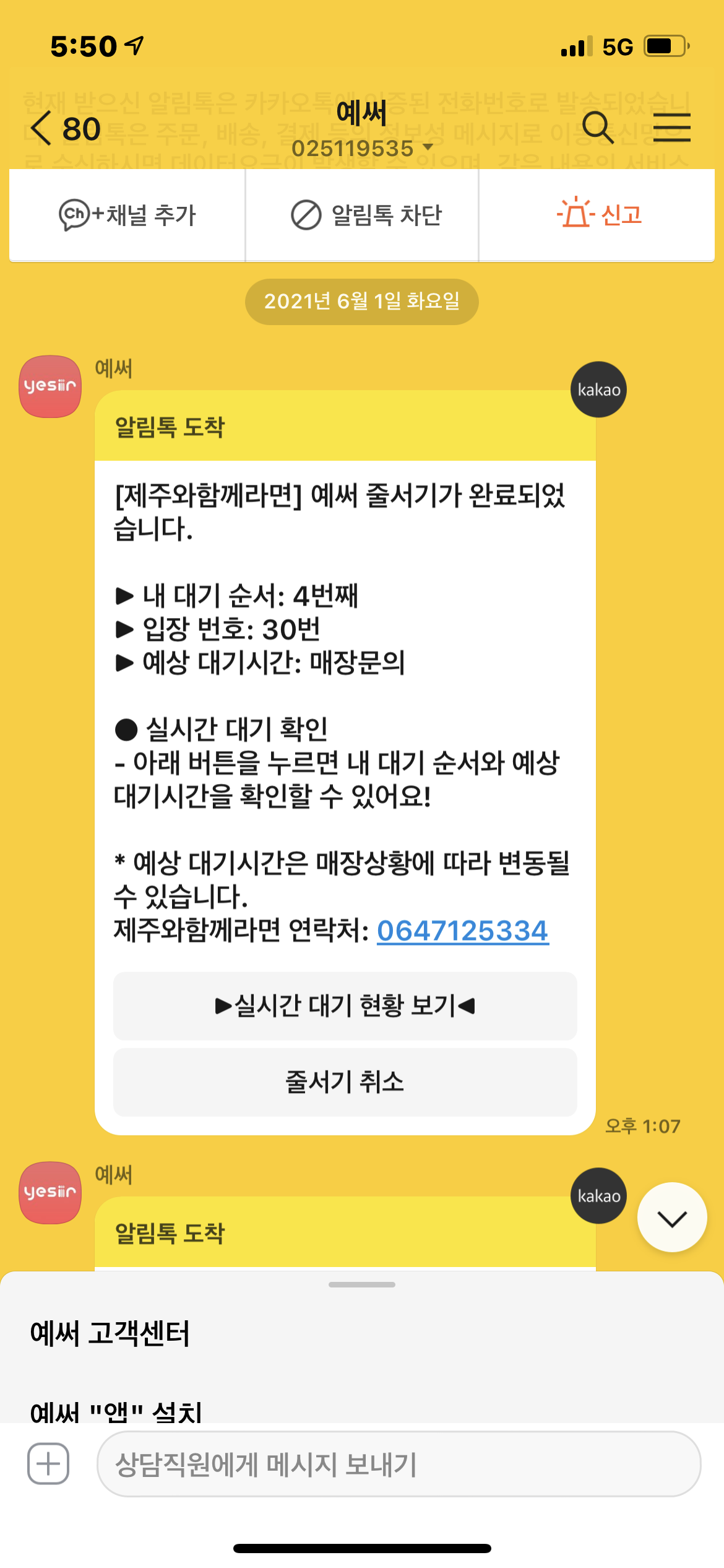 방문해서 웨이팅 걸어놓으면 이렇게 카톡이 옴 !